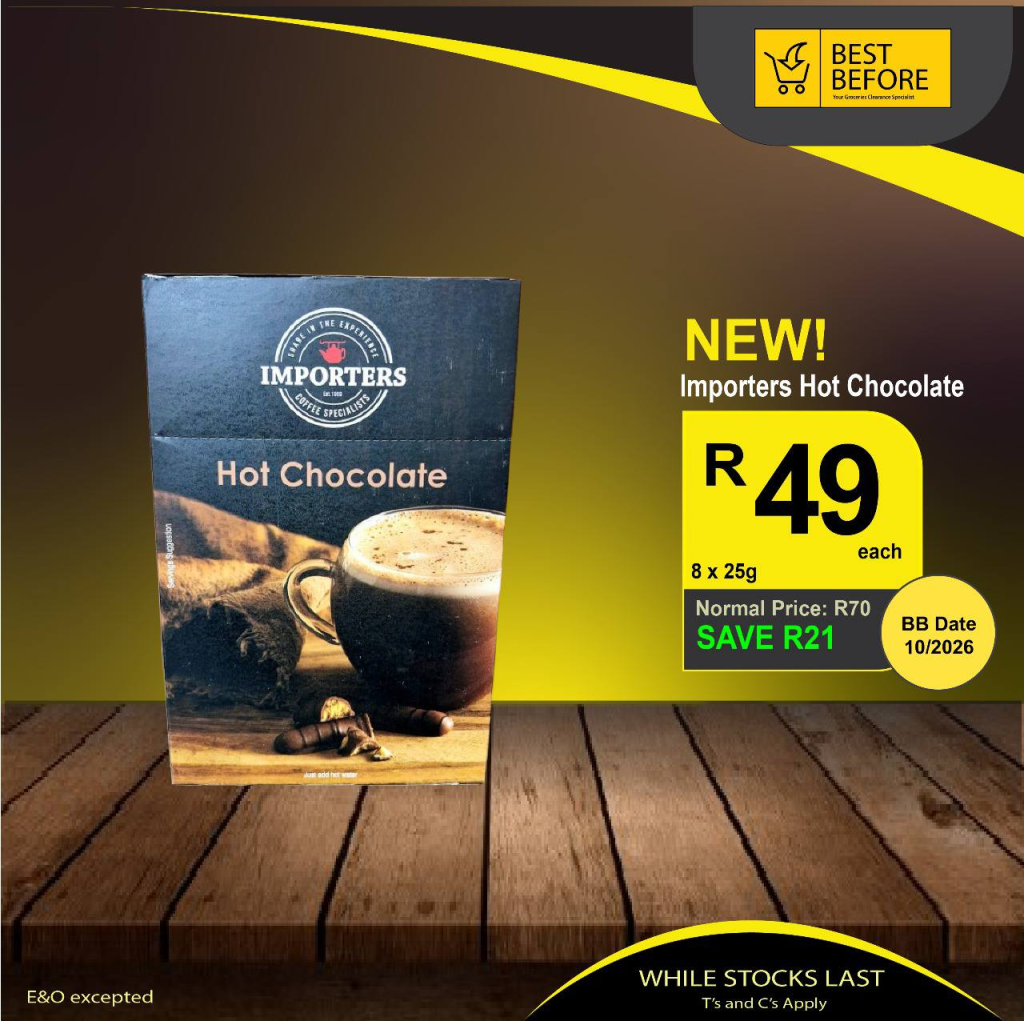 - Importers Hot Chocolate – Was R70, now only R49, save R21.