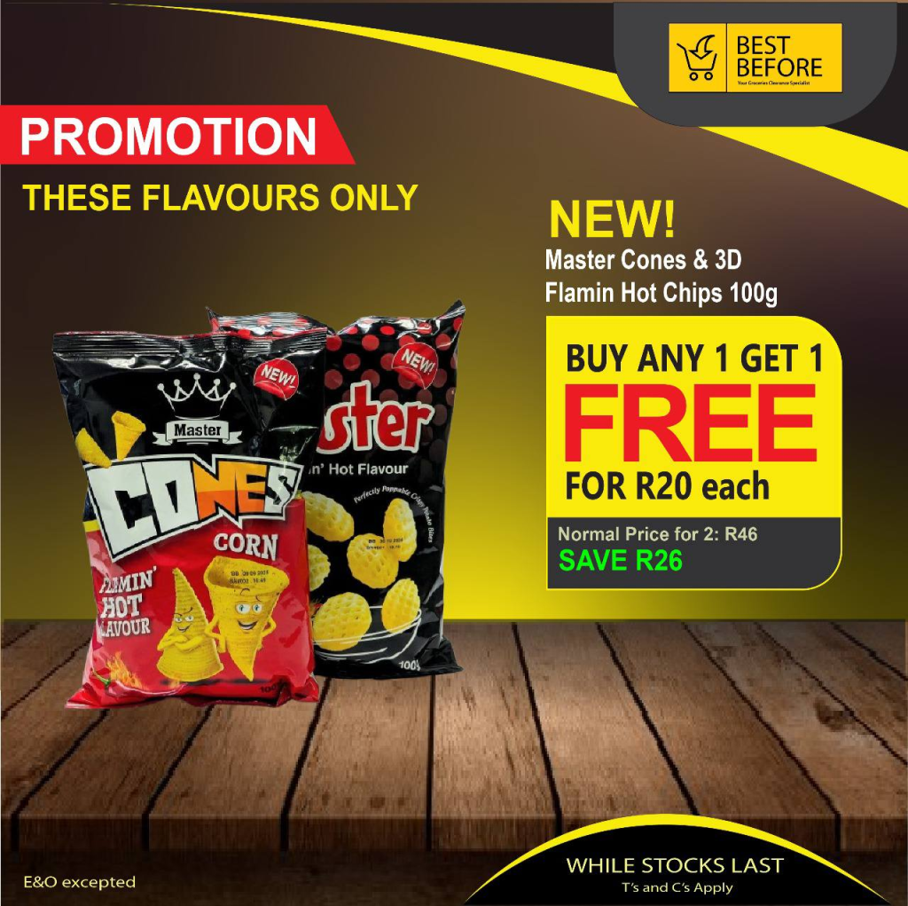 - Master Cones & 3D Flamin Hot Chips – Buy one, get one free for R20 each (was R46).