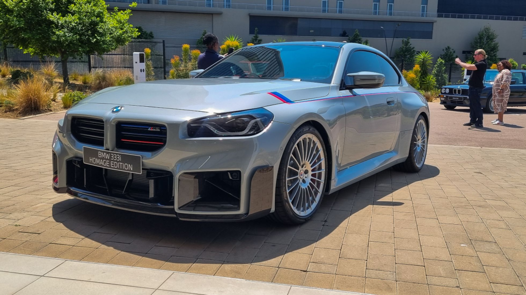The 333i Homage is based on the M2 and boasts a 3.0-litre straight-six turbo petrol engine delivering 353 kW and 600 Nm to the rear wheels (manual versions produce slightly less torque). The vehicle includes quad exhausts, Alpina wheels, bespoke spoilers, carbon bucket seats, Überkaro tartan armrest, and a commemorative plaque. The reserve price starts at R1 960 000. The M Drivers Pack increases the top speed to 285 km/h, while no models feature a sunroof due to the carbon roof design.