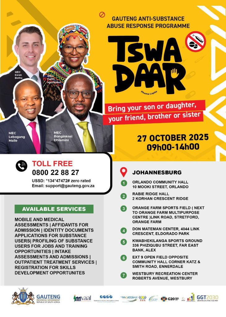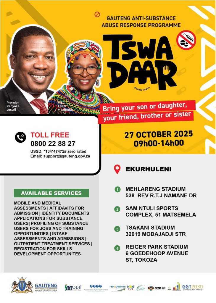 Gauteng is taking a firm stand against drug abuse. On Monday, 27 October 2025, Premier Panyaza Lesufi and Members of the Executive Council (MECs) will unveil Tswa Daar!, a provincewide campaign aimed at reclaiming communities and saving lives.