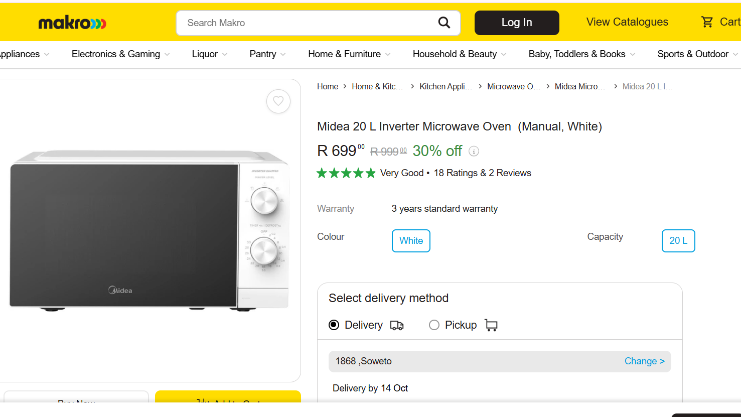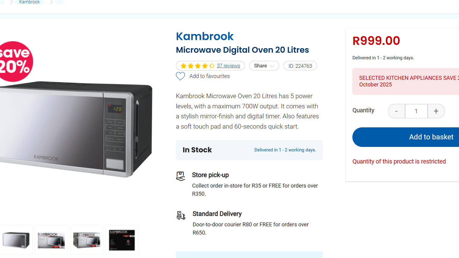 | Kambrook 20L Digital Microwave Oven | 20L | 700W | Digital Touch, Auto-Cook, LED Display | R1,299 | Various Retailers |