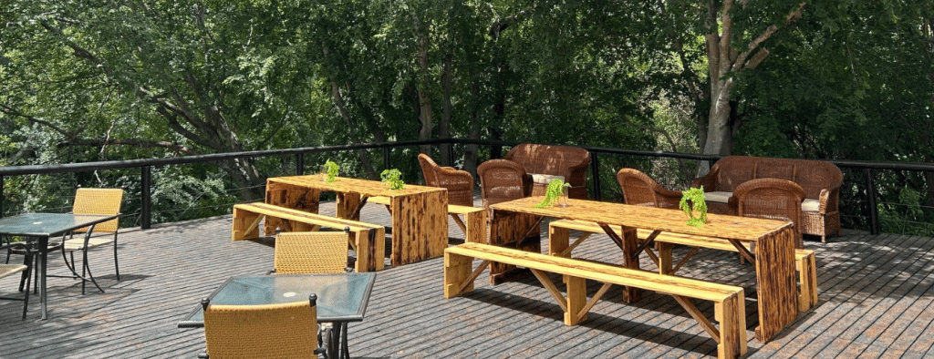 The site emphasises a country-style restaurant with an open deck overlooking the Crocodile River, ideal for pub-style food and relaxed gatherings in a bushveld setting.