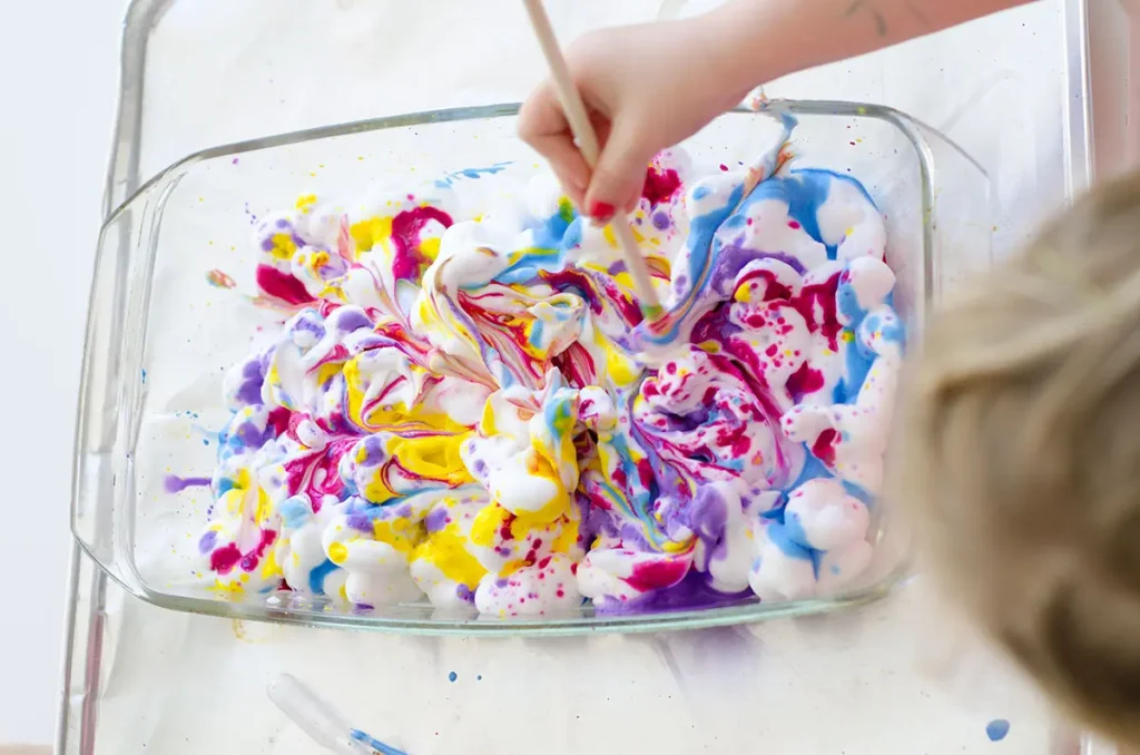 Mix shaving cream with a few drops of food colouring and swirl it with a stick. When kids press paper onto the surface, they create beautiful marbled art.