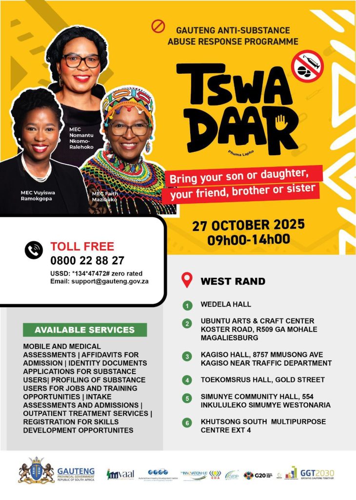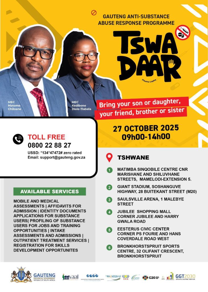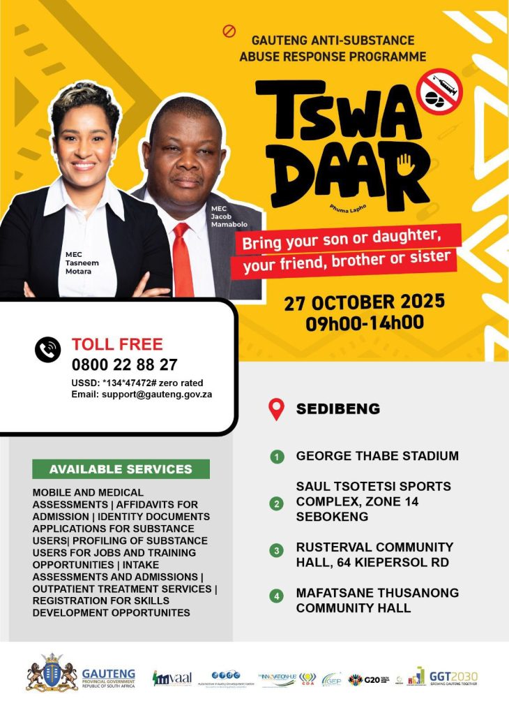 Gauteng is taking a firm stand against drug abuse. On Monday, 27 October 2025, Premier Panyaza Lesufi and Members of the Executive Council (MECs) will unveil Tswa Daar!, a provincewide campaign aimed at reclaiming communities and saving lives.