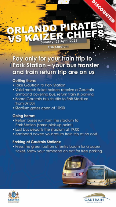 With thousands expected to travel to FNB Stadium, Gautrain has introduced a special travel arrangement for ticket holders.
